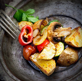 Combine vinegar, oil, salt, and pepper in a large bowl. Add vegetables and toss well. Arrange vegetables in a shallow, lightly greased roasting pan. Bake at 475 degrees for 10 minutes. Turn vegetables over with a large spoon or spatula and bake for another 10 minutes or until tender and browned. Once vegetables are cooked place in a bowl and add pesto and toss to coat evenly.