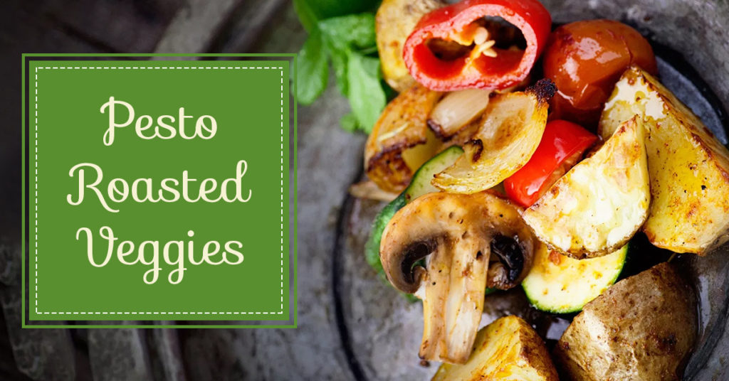 Combine vinegar, oil, salt, and pepper in a large bowl. Add vegetables and toss well. Arrange vegetables in a shallow, lightly greased roasting pan. Bake at 475 degrees for 10 minutes. Turn vegetables over with a large spoon or spatula and bake for another 10 minutes or until tender and browned. Once vegetables are cooked place in a bowl and add pesto and toss to coat evenly.